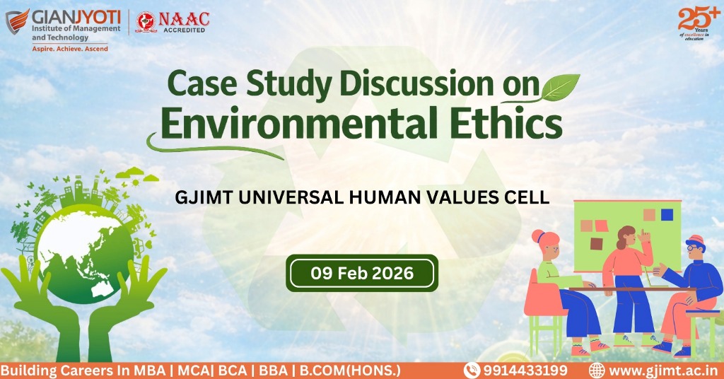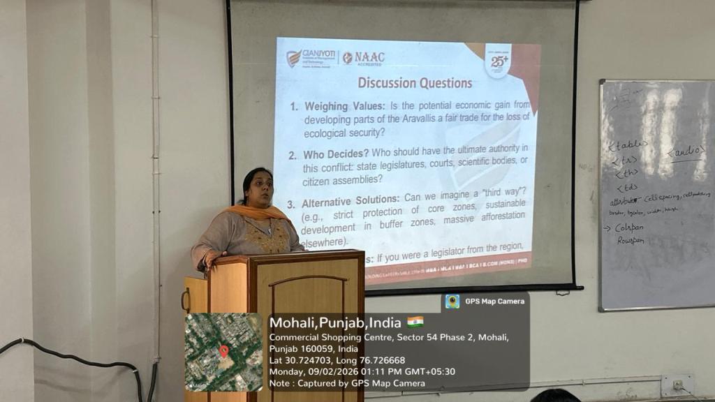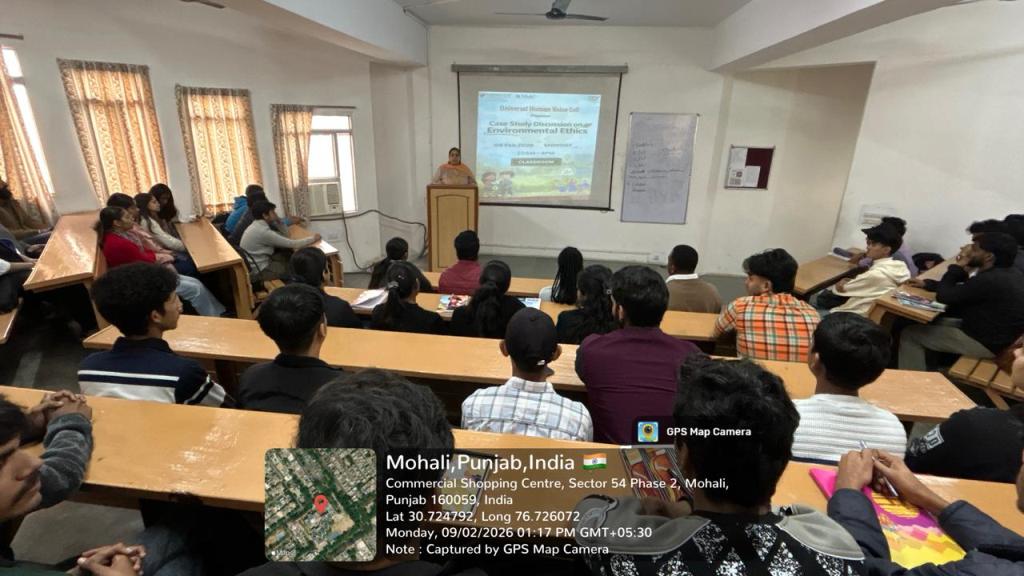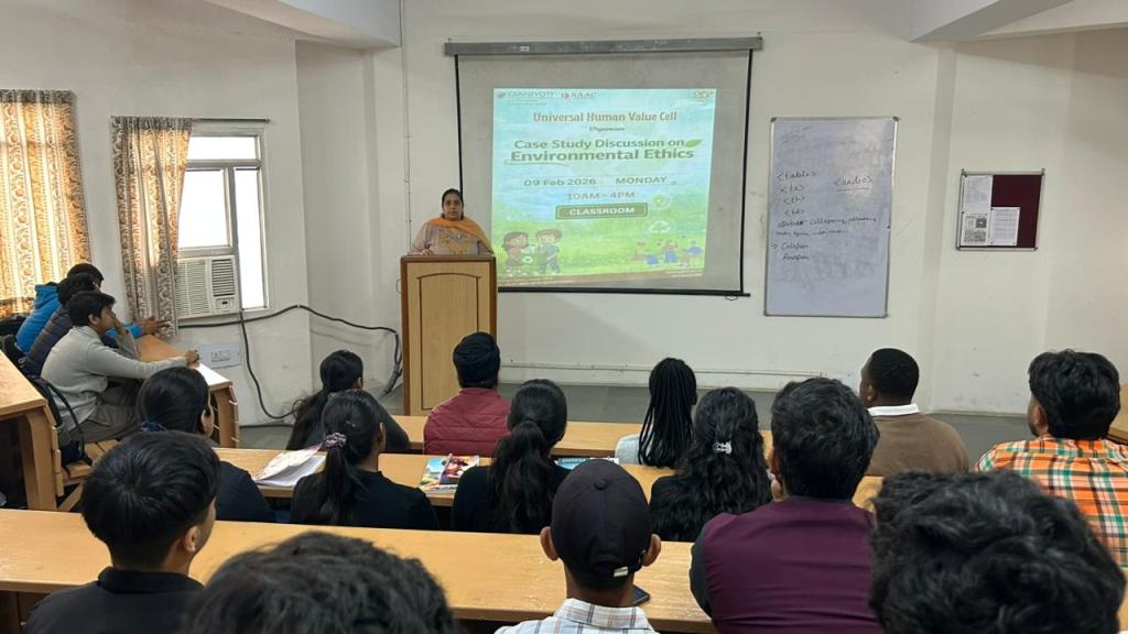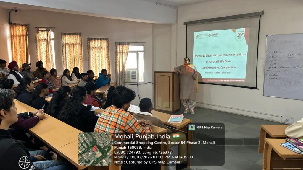 The Universal Human Values Cell organized a Case Study Discussion on “Environmental Ethics: Aravalli Hills Crisis – Development vs Conservation” for students to promote ethical awareness and responsible citizenship.