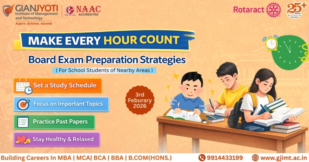 Gian Jyoti Institute of Management and Technology (GJIMT), through its Rotaract Club, organized an academic enrichment session titled “Make Every Hour Count – Board Exam Preparation Strategies” to support school students in their board examination preparation.