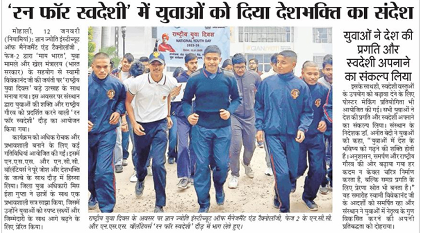 Gian Jyoti Institute of Management and Technology (GJIMT), Mohali, observed National Youth Day by organizing Run for Swadeshi to commemorate the birth anniversary of Swami Vivekananda. The initiative aimed to inspire youth towards self-reliance, patriotism, fitness, and nation-building.