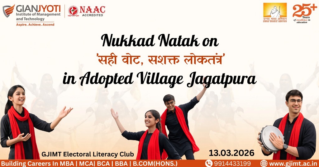 The Electoral Literacy Club in collaboration with NSS and NCC units of Gian Jyoti Institute of Management and Technology, under the Unnat Bharat Initiative, organized a Nukkad-Natak on the theme “Right Vote, Strong Democracy” at its adopted villageJagatpura.