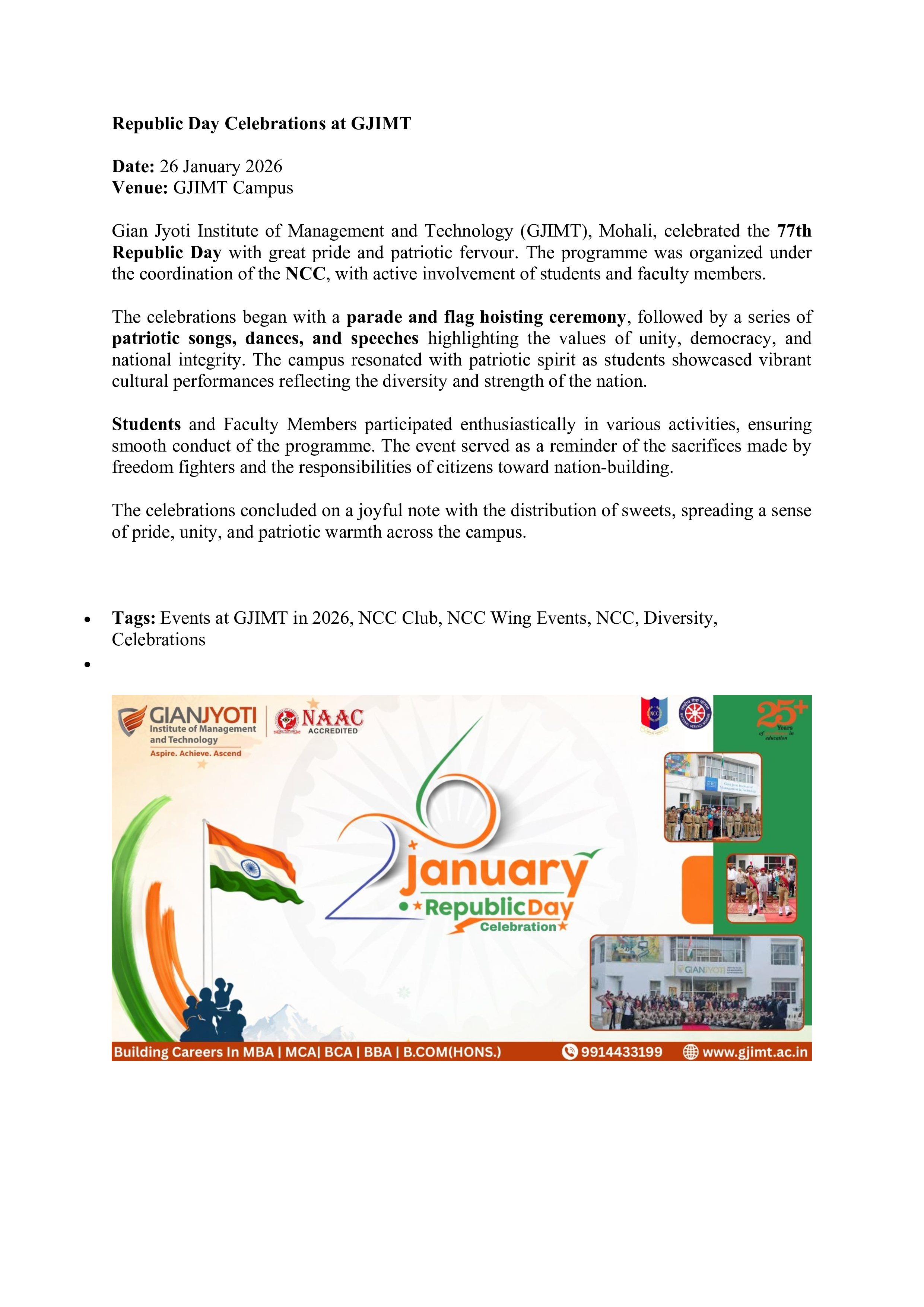 Gian Jyoti Institute of Management and Technology (GJIMT), Mohali, celebrated the 77th Republic Day with great pride and patriotic fervour. The programme was organized under the coordination of the NCC, with active involvement of students and faculty members.