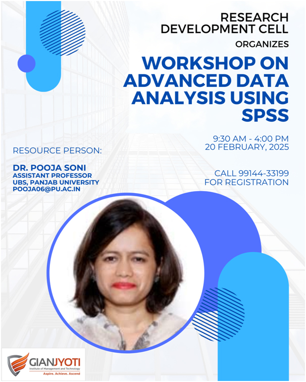 Gian Jyoti Institute of Management and Technology (GJIMT) organized a workshop on “Advanced Data Analysis Using SPSS” to strengthen students’ data analysis and interpretation skills.