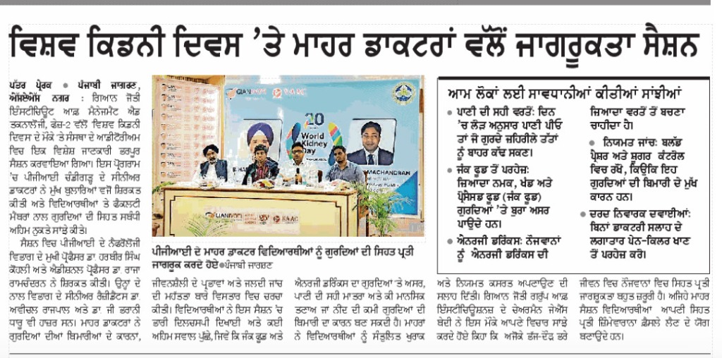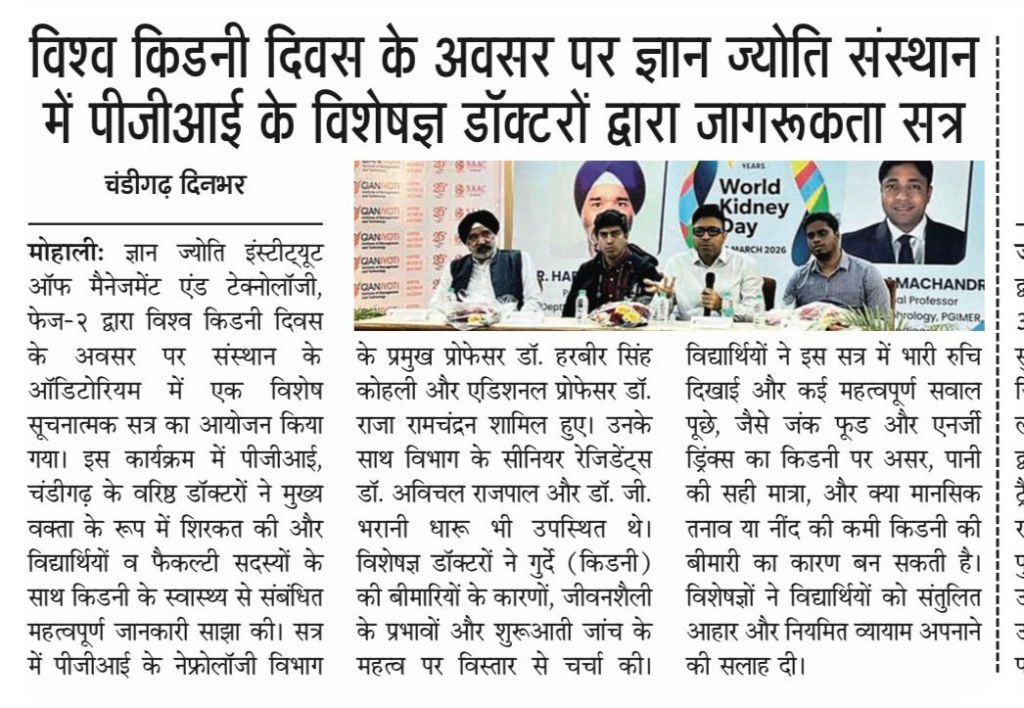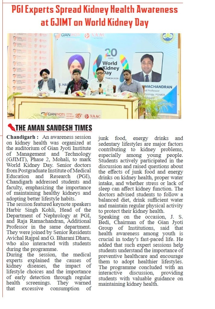 GJIMT observed World Kidney Day with an expert awareness session on kidney health. The programme featured medical specialists from Postgraduate Institute of Medical Education and Research, including Dr.Harbir Singh Kohli and Dr.Raja Ramachandran, who addressed students on the causes, prevention, and early detection of kidney diseases.